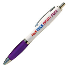 A white ballpoint pen with a purple grip and black ink. Pink and blue and purple text on one side reads Fuck fuck fuckity fuck